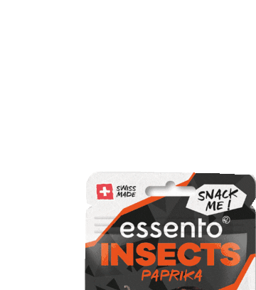 A close-up of an Essento Insects Paprika snack package, proudly Swiss Made and boasting high protein, vitamin B12, and fiber.