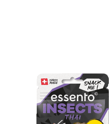 Animated Essento Insects Thai snack package, highlighting "Swiss Made," "Snack Me!," "NEU," high protein, and B12.