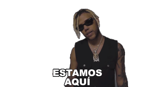 A man wearing sunglasses and a black vest says 'Estamos Aquí' (We Are Here), indicating his presence.