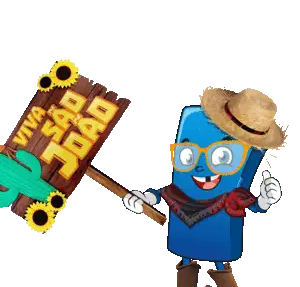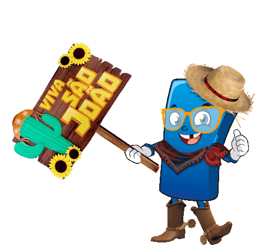 Estojito Qualipack character celebrates São João, wearing a straw hat, glasses, and cowboy boots, holding a 'Viva São João' sign.