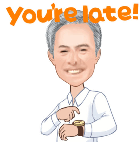 Estudio Biblico sticker featuring a cheerful cartoon man pointing at his watch with the text 'You're late!'.