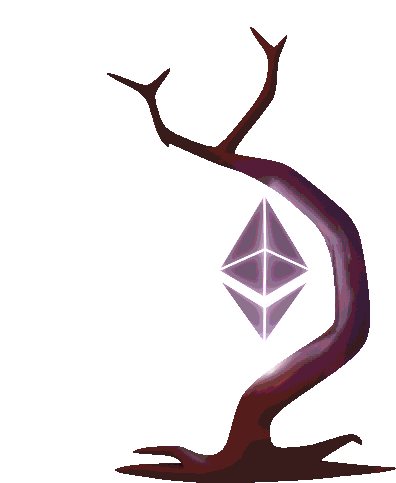 Eth Tree Boroda features a gnarled tree with a glowing, pulsing Ethereum symbol at its core.