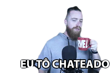 A bearded man with a mohawk holds a Marvel mug, expressing sadness and saying 'I'm upset' in Portuguese.