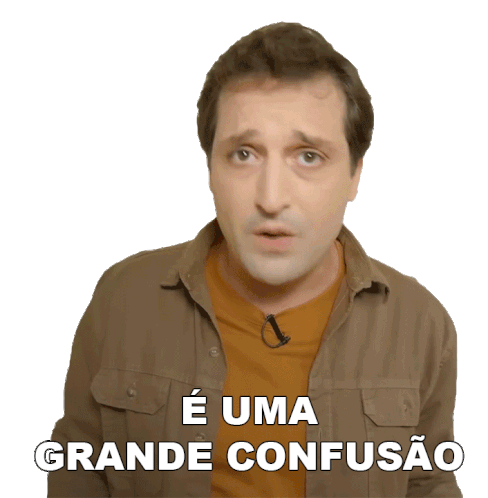 Gregório Duvivier expresses confusion, saying "É uma grande confusão" in a brown shirt.