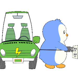 A cute penguin pulls a green electric vehicle (EV) by its charging cable, ready to power up.