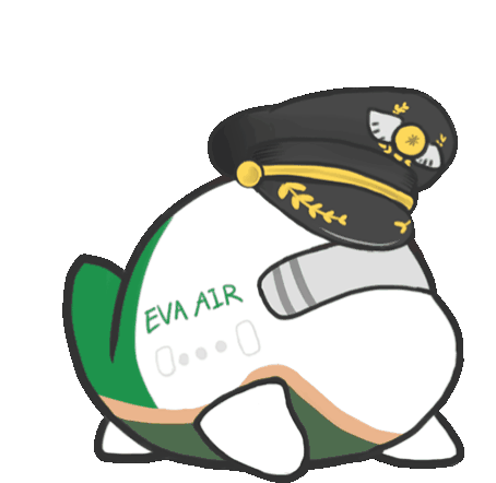 An adorable Eva Air airplane character wearing a pilot's hat, with a cute animated effect of floating red bubbles.