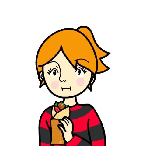 Evazc, a cartoon girl with orange hair, happily eats a falafel wrap while wearing a red and black striped shirt.