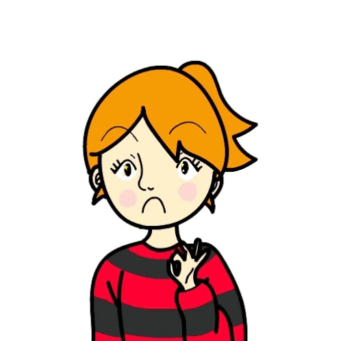 Evazc, an orange-haired girl in a red and black striped shirt, makes a sad face in this expressive sticker.