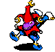 Animated pixel art sticker of Bobo from Everhood 2, a jester with a purple face and blue legs, in a dynamic pose.