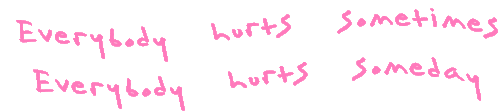 Pink handwritten text sticker featuring the emotional lyrics "Everybody Hurts Sometimes Everybody Hurts Someday."
