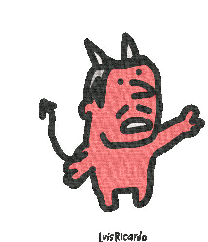 A cartoon red devil by Luis Ricardo, with horns, a mustache, and a surprised expression.