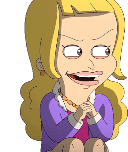 Lola Skumpy from Big Mouth with a mischievous, evil grin, hands clasped, plotting something devious.