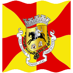 Waving flag of Evora, Portugal, featuring its coat of arms with a knight on horseback and the motto 'Sempre Leal'.