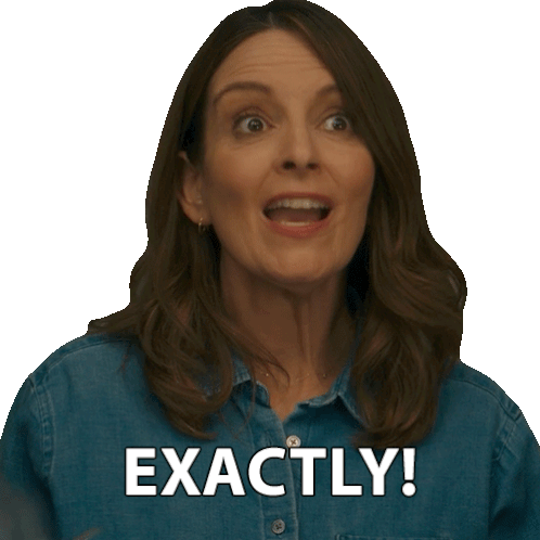Kate, wearing a denim shirt, reacts with a determined smile, emphatically saying 'Exactly!' to express agreement.