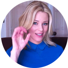 Elizabeth Banks makes a precise gesture, emphasizing a point with a focused expression, her blonde hair framing her face.