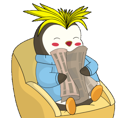 A cheerful pudgy penguin excitedly announces "GOOD NEWS!" while holding a pink envelope and a mail bag.