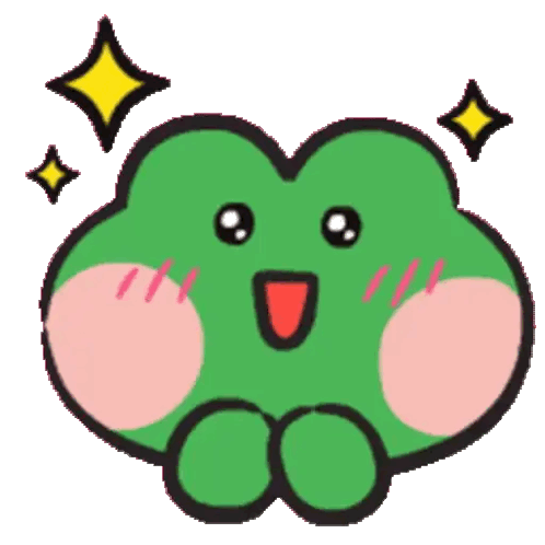 A vibrant green frog with rosy cheeks and sparkling stars, beaming with an open mouth, conveying extreme excitement.