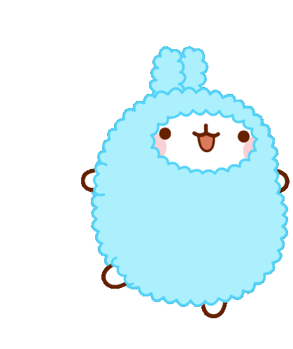 Molang, the adorable character, is seen in a fluffy blue outfit, wiggling with excitement and full of energy.