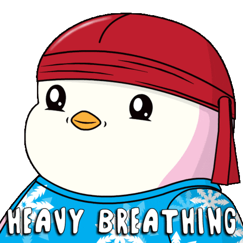 A pudgy penguin character in a red bandana and blue shirt, showing heavy breathing due to excitement or nervousness.