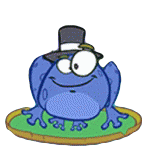 Galinha Pintadinha's excited frog character, wearing a top hat, bounces happily on a green leaf.