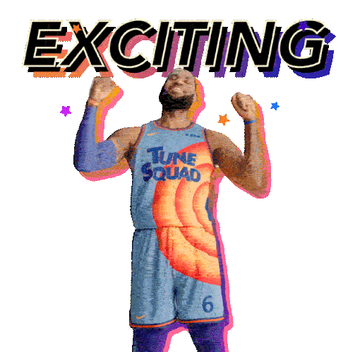 LeBron James in his Tune Squad jersey celebrates excitedly with fists raised, surrounded by stars and the word 'EXCITING'.