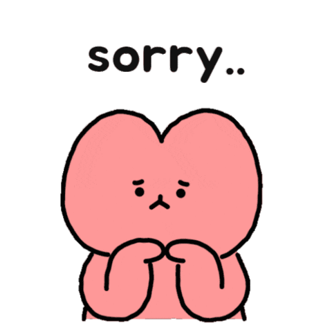 A cute pink blob character with a sad expression and clasped hands, displaying the text 'sorry..' to express apology or regret.