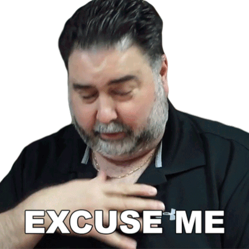 Chris Frezza with an expressive 'Excuse Me' gesture, hand on chest, looking surprised or seeking attention.