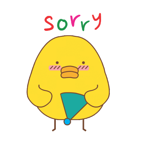 A cute yellow duck character with blush marks holds a party hat, then bows its head as the word 'Sorry' appears.
