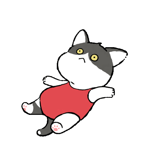 A cute cartoon cat in a red outfit performs exercises, doing a sit-up or crunch with effort.