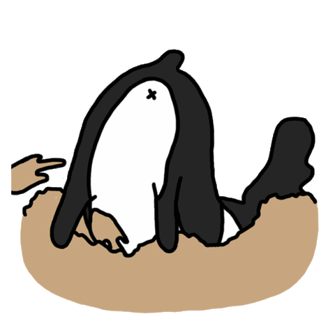 A cute cartoon character, resembling a penguin, is comically stuck headfirst in a brown hole, unable to escape.