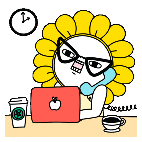 A sunflower-headed character with glasses is overwhelmed by work, talking on the phone with a laptop and coffee.