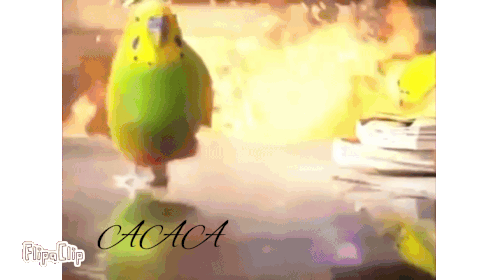 A vibrant green and yellow Explosionparrot budgie bobs its head with an 'Aaa' sound effect, set against a bright, warm background.
