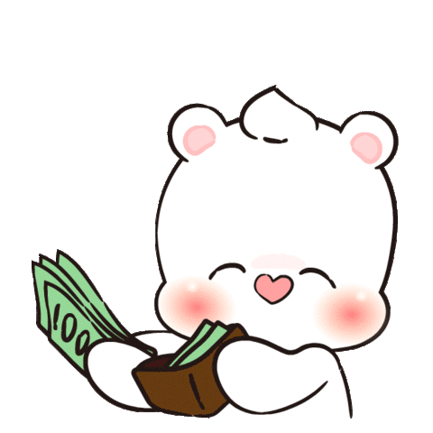 A cute, happy bear character pulls a stack of green banknotes from a brown wallet, ready to spend money.
