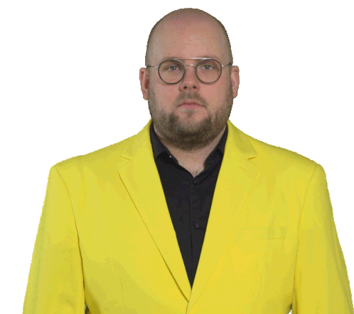 A man with glasses and a yellow blazer looks shocked and confused, raising his eyebrows in disbelief.