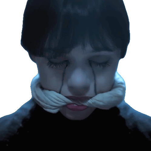 Wednesday Addams opens her eyes, revealing black tears streaming down her face, with a scarf tied around her neck.