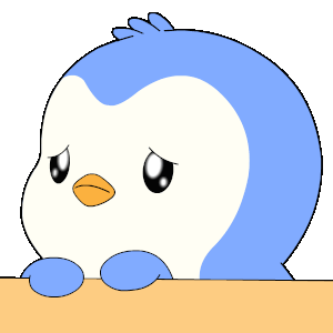 A cute blue and white penguin with big, sad puppy eyes, looking down as if begging or feeling upset. Conveys a mood of sadness or longing.