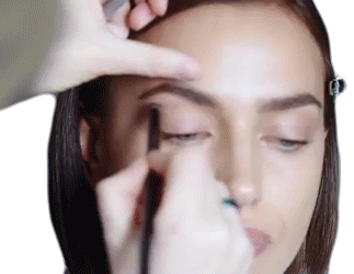 A makeup artist applies eyeshadow to Irina Shayk's eyelid with a brush, creating a glamorous look.