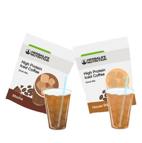 Two Herbalife Nutrition High Protein Iced Coffee drink mixes, Mocha and House Blend, with ready-to-drink cups.