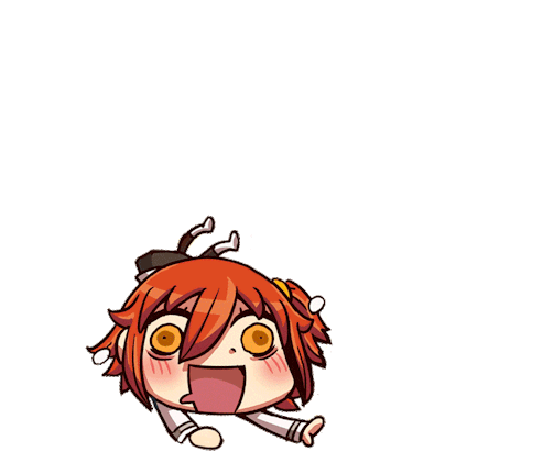 An FGO anime character, looking extremely excited and crazy with wide eyes and an open mouth, flails its arms and legs in a frantic motion.