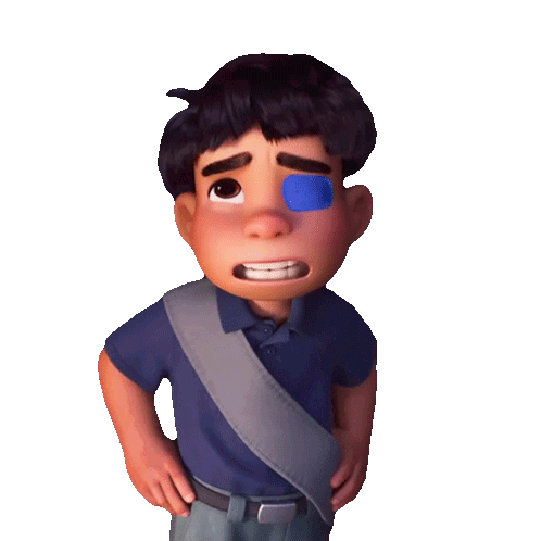 Elio, the animated character, displays a clearly forced and awkward fake smile, with a blue mark under his eye.