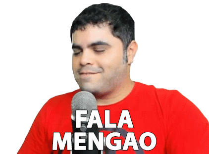 Professor Procopio enthusiastically says 'Fala Mengao' into a microphone, celebrating Flamengo football.
