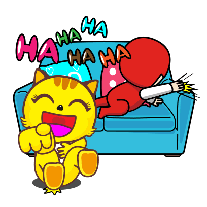 A cheerful yellow cat laughs and points as its red friend tumbles off a blue couch, surrounded by 'HAHAHA' text.