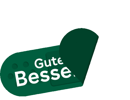 An animated green bandage sticker with 'Gute Besserung' (Get Well Soon) text and floating red hearts, perfect for well wishes.