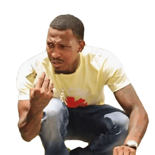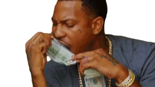 A man in a yellow shirt squats, holding a stack of US dollar bills and putting them into his mouth.