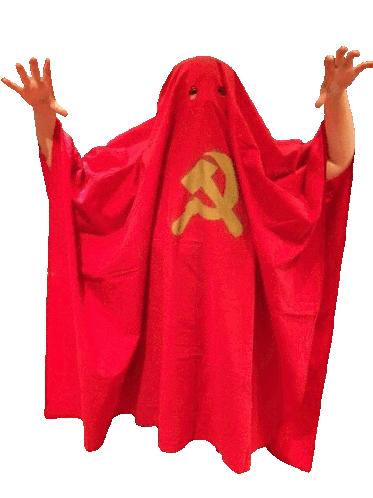 Animated sticker of a ghost-like figure wearing a red cape with the hammer and sickle, representing the 'Ghost of Communism'.