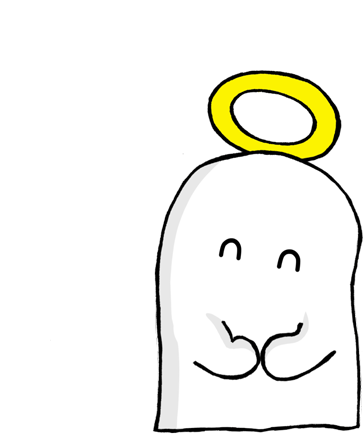 A cute white ghost character with a halo and clasped hands, smiling sweetly.