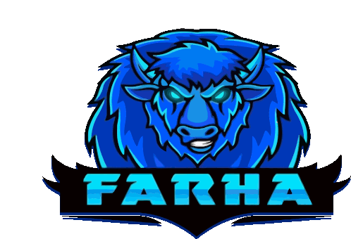 Animated blue buffalo mascot logo with glowing eyes and 'FARHA' text, representing Farha Tv.
