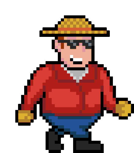 Farmer Ron, the pixel art character from Wolf Game, walks with a confident stride, wearing his signature straw hat and sunglasses.