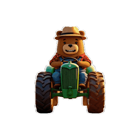 a brown teddy bear is driving a green tractor