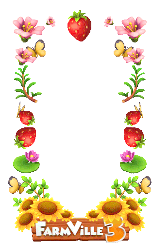 A vibrant Farmville 3 frame sticker adorned with strawberries, pink flowers, butterflies, green leaves, water lilies, and sunflowers.
